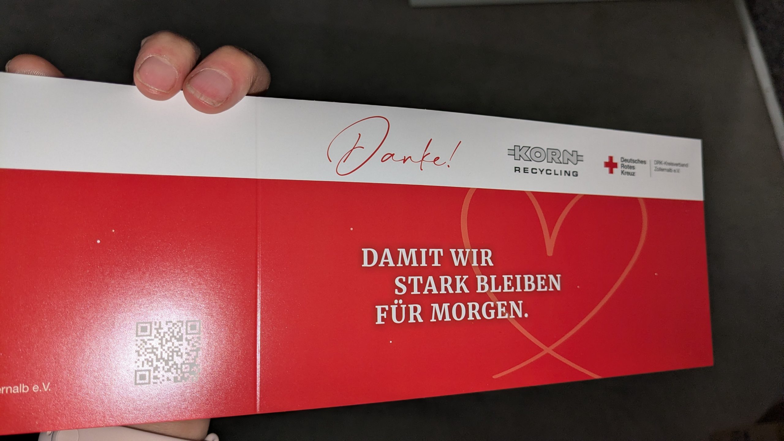 Briefe lagen dazu bereits in den vergangenen Tagen bei vielen unserer Kolleginnen und Kollegen im Briefkasten. Es war ein hochwertiger Umschlag im gemeinsamen Design von KORN Recycling und dem DRK, eine persönliche Ansprache und eine Karte mit der Botschaft: „Danke!“ Was zunächst wie ein klassisches Informationsschreiben wirkte, entpuppte sich als echtes Zeichen der Wertschätzung und als Beitrag zu mehr Sicherheit, Vorsorge und Unterstützung im Alltag. Die Rückmeldungen ließen nicht lange auf sich warten: Überraschung, Freude und bei vielen das Gefühl, dass wirklich an sie gedacht wird.